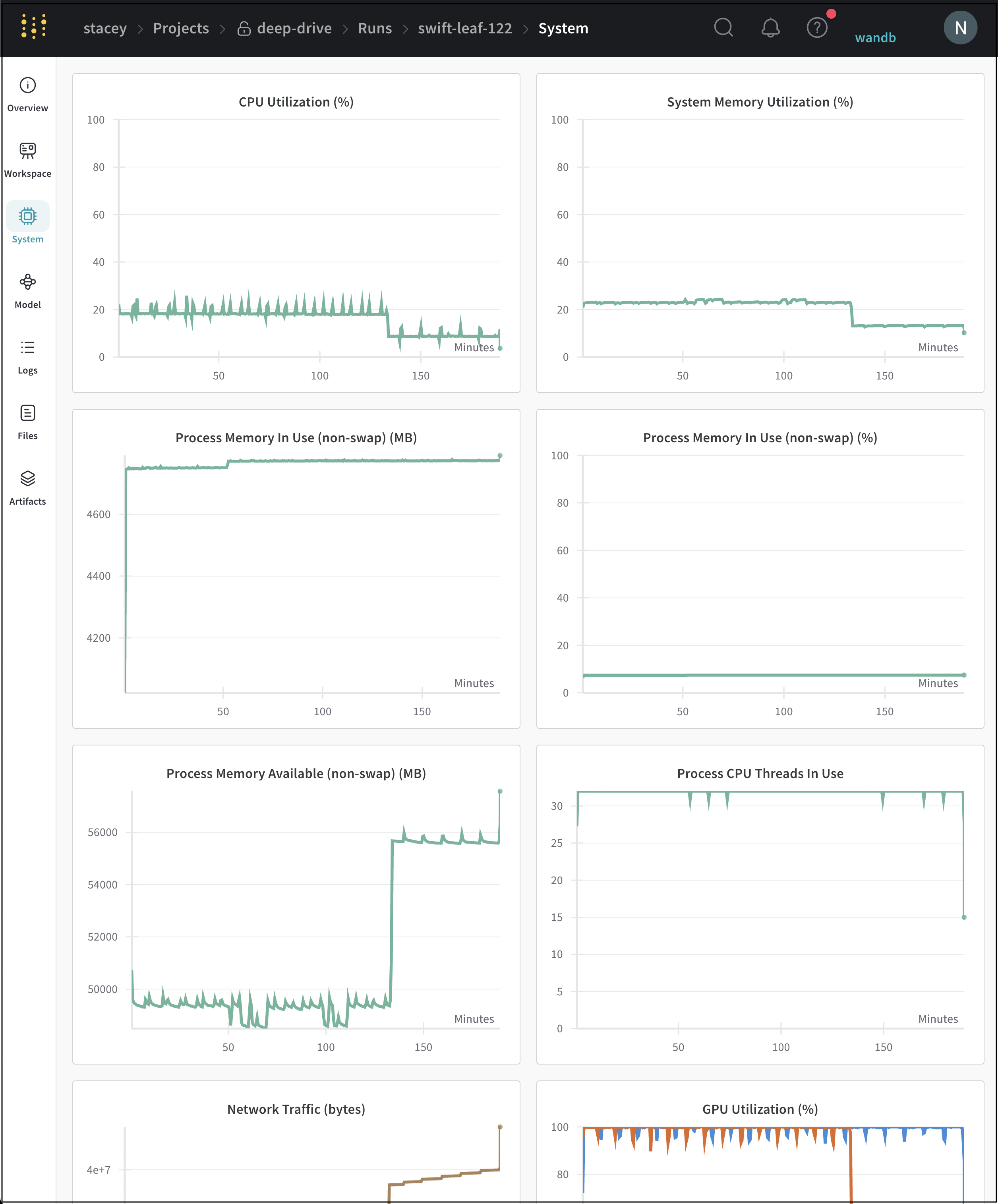 System 탭은 CPU 사용률, 시스템 메모리, 디스크 I/O, 네트워크 트래픽, GPU 사용률 등과 같은 특정 run에 대해 추적된 시스템 메트릭을 보여줍니다. W&B가 추적하는 시스템 메트릭의 전체 목록은 시스템 메트릭을 참조하십시오.